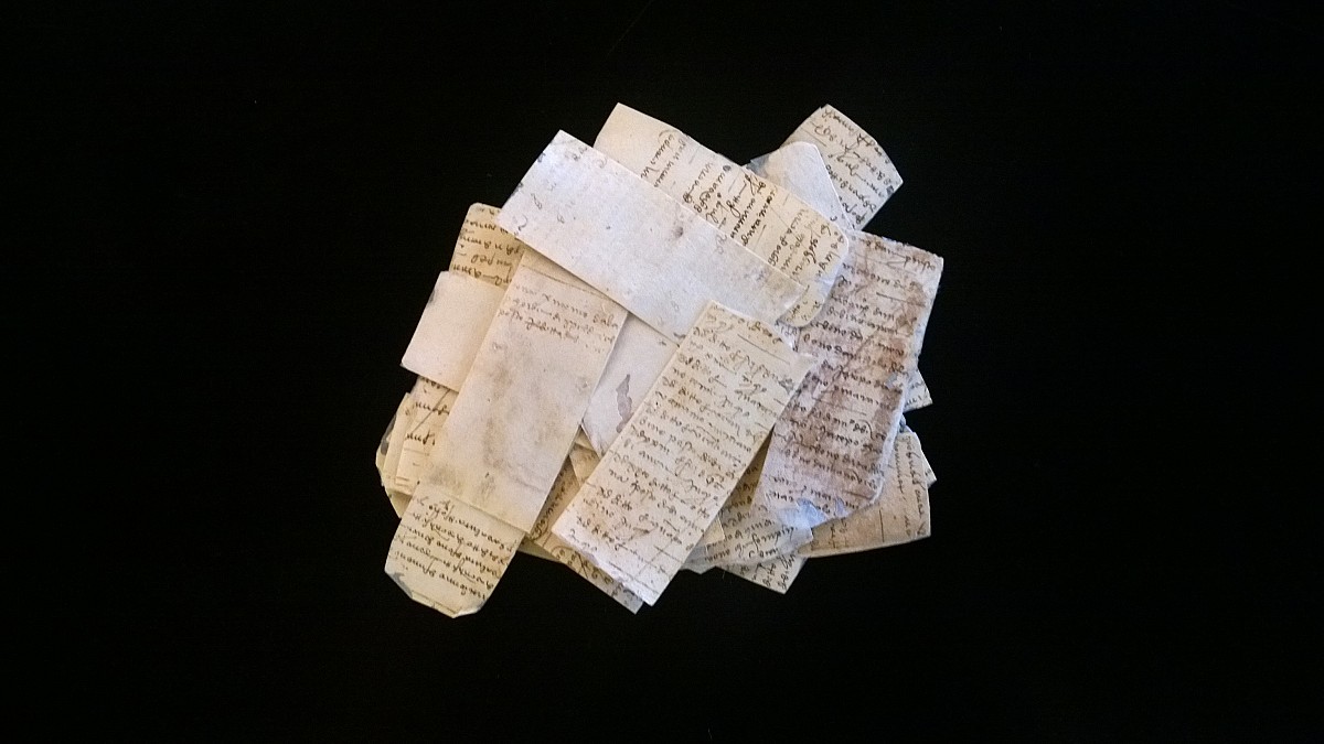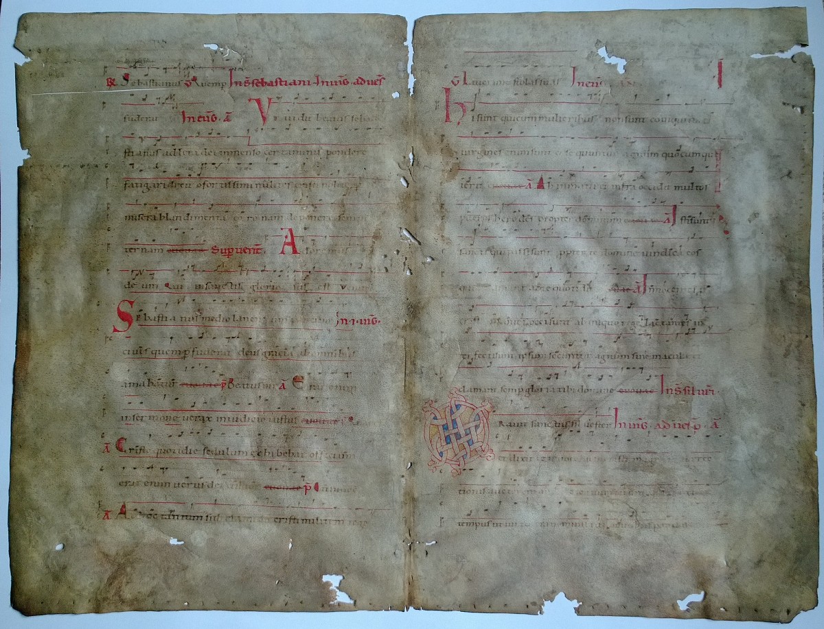 Il più antico registro contabile del Monte di pietà di Bologna ha alle spalle oltre cinquecento anni di vita e una storia affascinante da raccontare. Infatti, la sua vicenda compositiva rispecchia in qualche modo le prime perigliose fasi della nascita del Monte di pietà di Bologna, nel 1473, e quelle della sua stabile fondazione, nel 1504. Una vicenda già di per se così singolare, che riserva però altre sorprese come quelle che sono venute alla luce in seguito al restauro del Libro Giornale. Come vedremo le particolari modalità di fabbricazione del registro permettono di fare riemergere alcuni testi inediti e diversi episodi unici della culturale medievale che nulla hanno a che fare con la storia del Monte di pietà di Bologna e nulla hanno a che fare con il contenuto del Libro Giornale (1473-1519). Quei testi erano in gran parte celati, prima del restauro, tra le componenti del codice che formavano la coperta. Stiamo parlando di alcuni bifogli di pergamena e di alcune carte conservate integralmente o a brandelli, che sono giunti sino a noi "ancorati" alla legatura che proteggeva il registro. Le membrane sono realizzate con pelle animale adeguatamente conciata e trattata per accogliere la scrittura e contengono ciò che sopravvive di un antico codice religioso del XII secolo, mentre il resto consiste in incomplete scritture mercantili risalenti ai primi anni del Quattrocento. Le une e le altre hanno potuto resistere al degrado, alla distruzione del tempo poiché perduta la loro originaria funzione ne hanno guadagnata una nuova, certo meno nobile che gli ha permesso, però, di vincere l'oblio cui sembravano destinati. Le pergamene veicolavano un testo adibito al canto religioso, le carte erano servite per ospitare la registrazione di poste che avevano lo scopo di fissare gli affari finanziari di una compagnia di mercanti. Pelli animali e stracci di carta che hanno acquisito una nuova, inedita e inaspettata vita, dopo il restauro: sono diventati materiali di risulta da impiegare in una qualche legatoria bolognese per rafforzare le legature di registri posti in vendita sul mercato locale. La coperta che formava la legatura del più antico Libro Giornale del Monte di pietà di Bologna aveva l'essenziale funzione di proteggere il contenuto, ma essa ci consente di ricomporre due distinti aspetti della cultura materiale dei manoscritta medievale. Ma andiamo con ordine e dedichiamo adeguato spazio ai nostri frammenti pergamenacei, tenendo bene in mente che se il codice liturgico risale a oltre ottocento anni fa, il supporto documentario con cui tali lacerti hanno co-esistito per oltre mezzo millennio, fu allestito tre secoli più tardi, e, ciononostante, ha pur sempre cinquecento anni. Del codice liturgico sopravvivono tre bifogli vergati con una splendida grafia definibile come tardo carolina. Si tratta di una scrittura che nata a seguito della Renovatio promossa da Carlo Magno offrì i suoi frutti più maturi nel Pieno Medioevo, allorché tale riforma grafica carolingia si affermò nella Societas christiana, tra X e XII secolo. Il manoscritto presenta anche una notazione musicale che serviva ai religiosi per intonare i testi a Dio. Il codice esibisce un ricco apparato decorativo da cui emergono alcuni splendidi capolettera di dimensioni maggiori rispetto al corpo delle lettere che compongono il resto del testo. Alcuni dei testi trascritti sono stati identificati da Alessandra Fiori, esperta musicologa del Medioevo. La studiosa suggerisce a proposito del codice che, nel suo stato originario, esso fosse un Antifonario, un libro, cioè, che raccoglieva i canti dell’Ufficio, ossia la Liturgia delle Ore. Si tratta, quindi, di una testimonianza di canto gregoriano. Un esame appena più approfondito sulle membrane, compiuto precedentemente al loro distacco, ha subito rivelato caratteristiche di notevole interesse, confermate anche dopo il restauro, dal momento che vi sono brani completamente sconosciuti al repertorio liturgico-musicale e altri tramandati esclusivamente da un’altra fonte.